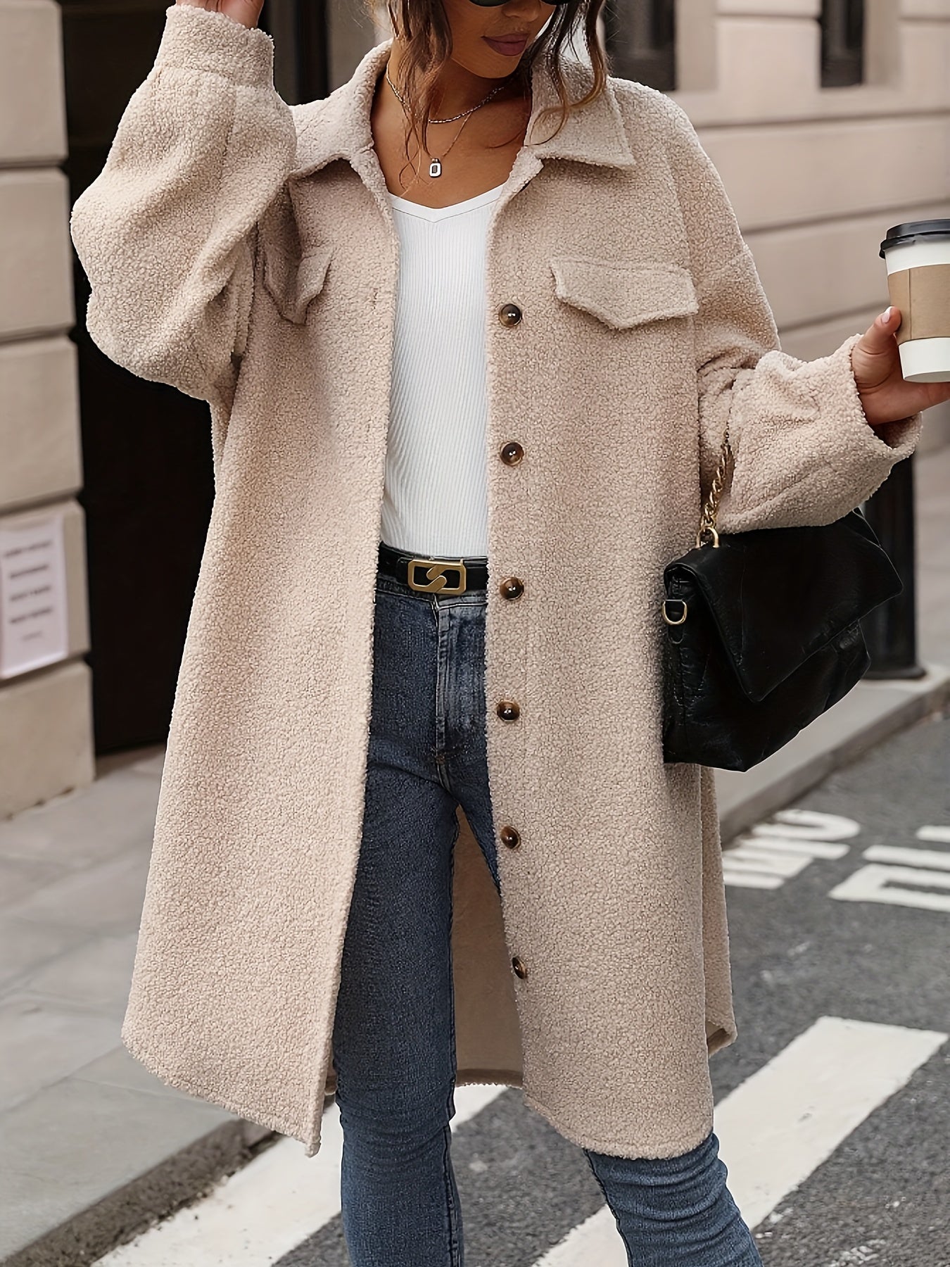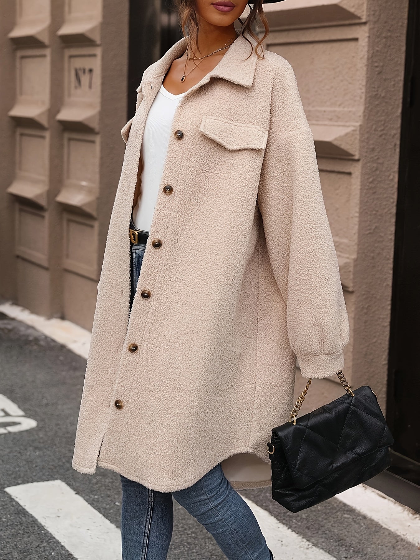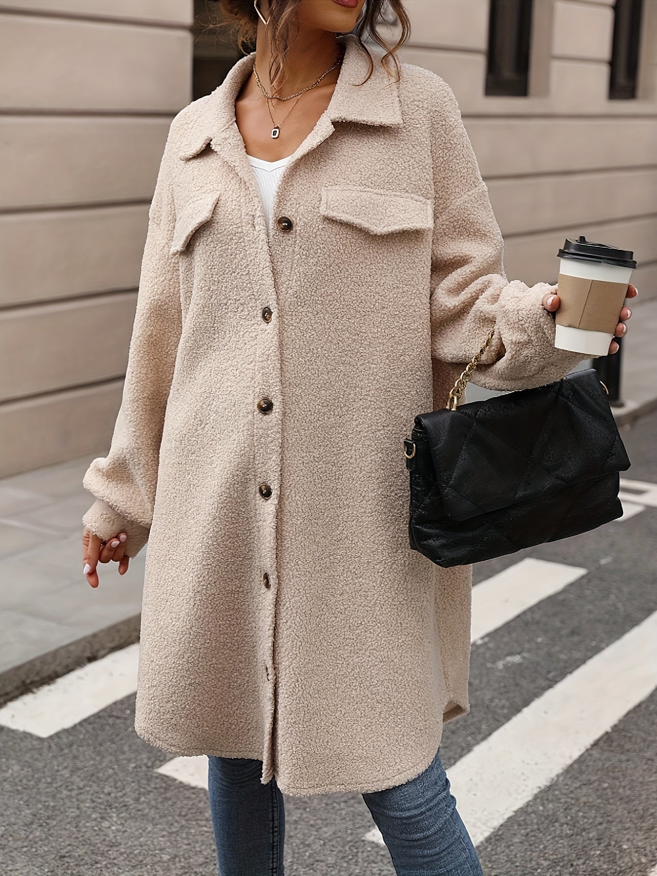 Denne lange teddyskjorte er et perfekt miks af casual stil og klassisk snit. Det bløde, strukturstrikkede materiale holder dig varm, mens den løse pasform og de markante knapper giver et trendy og ubesværet look. Den afrundede kant og brystlomme med flap tilføjer visuelle detaljer, der gør jakken både praktisk og stilsikker.