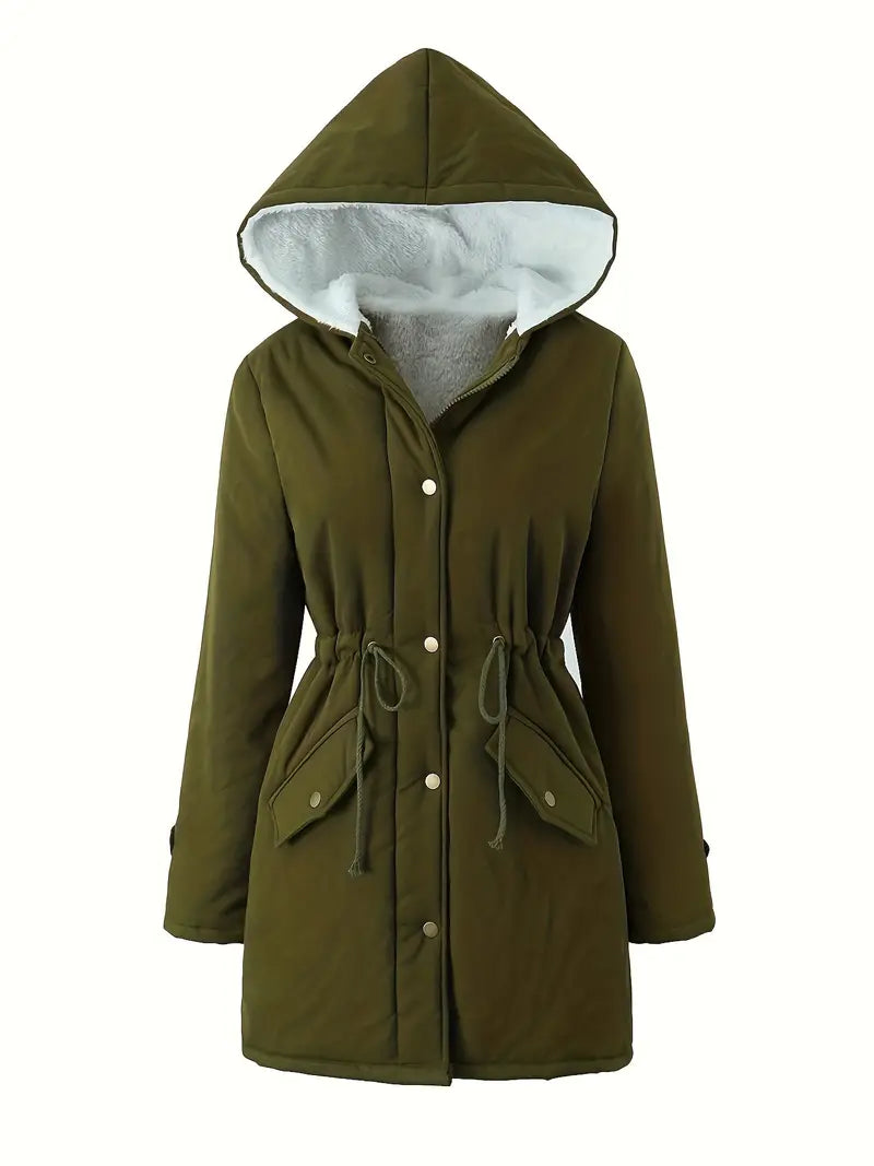 Denne parkajakke er foret med blødt fleece og designet til at holde dig varm og komfortabel på kolde vinterdage. Den justerbare snøre i taljen fremhæver figuren, mens den rummelige hætte og de praktiske lommer giver både beskyttelse og opbevaringsplads. En alsidig vinterfavorit til både byliv og natur.