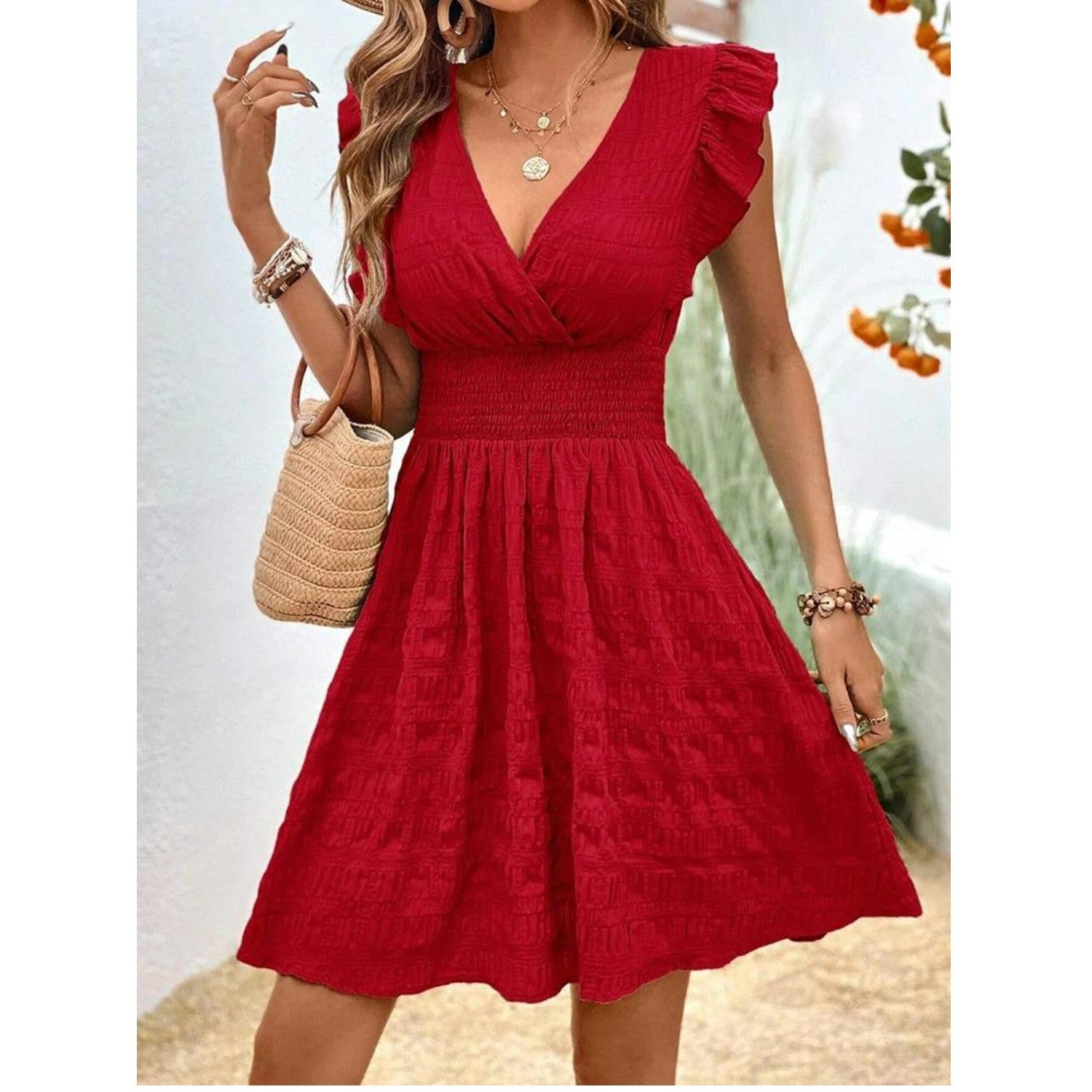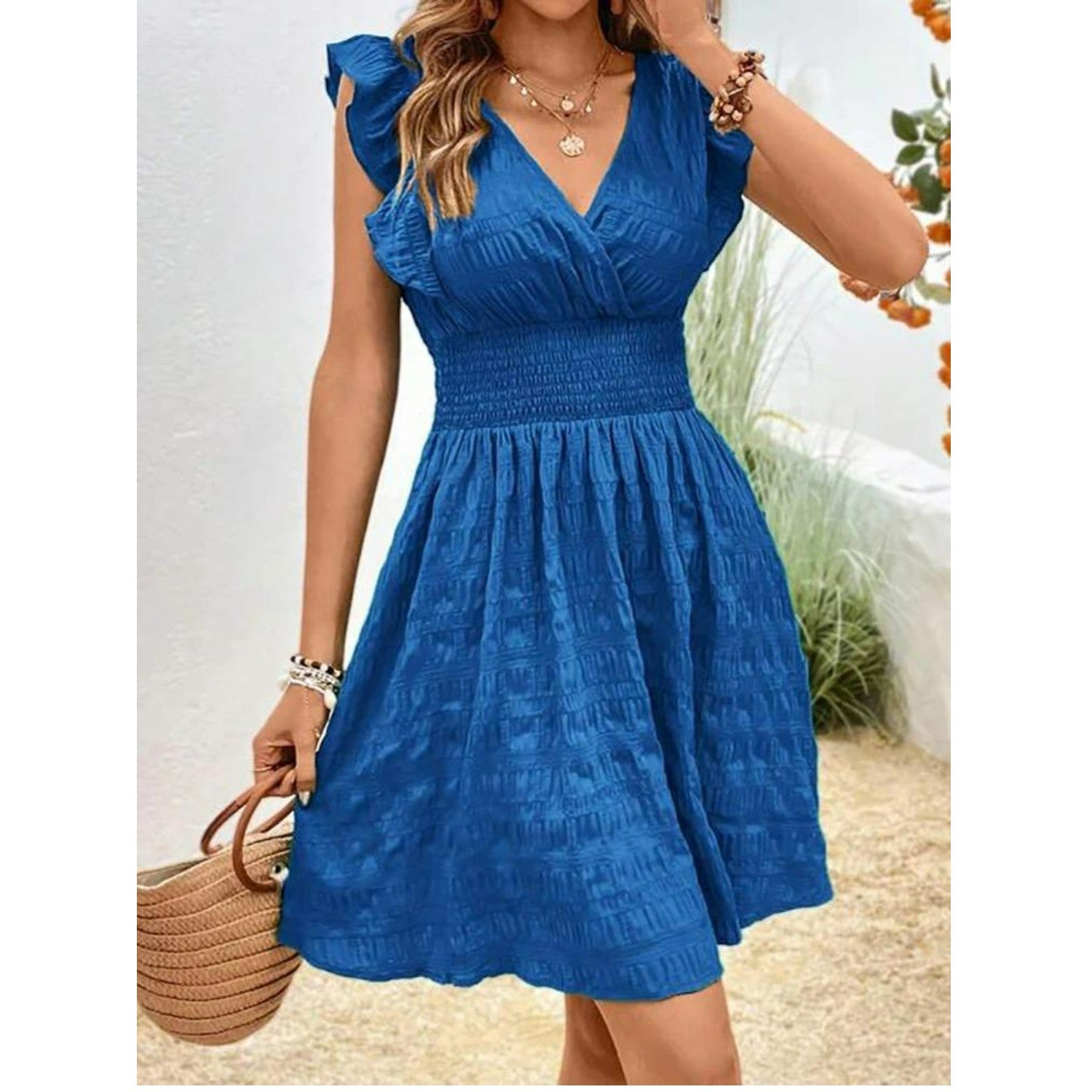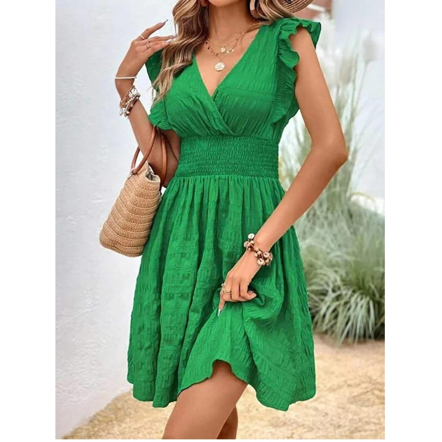 Forkæl dig selv med vores Sommerkjole med Flæseærmer, der kombinerer elegance og komfort. Den flatterende V-halsudskæring fremhæver din silhuet, mens de legesyge flæseærmer tilføjer et feminint touch. Kjolen er fremstillet af en let og åndbar bomuldsblanding, der sikrer, at du forbliver kølig og stilfuld hele dagen. Perfekt til både hverdagsbrug og sommerfester.