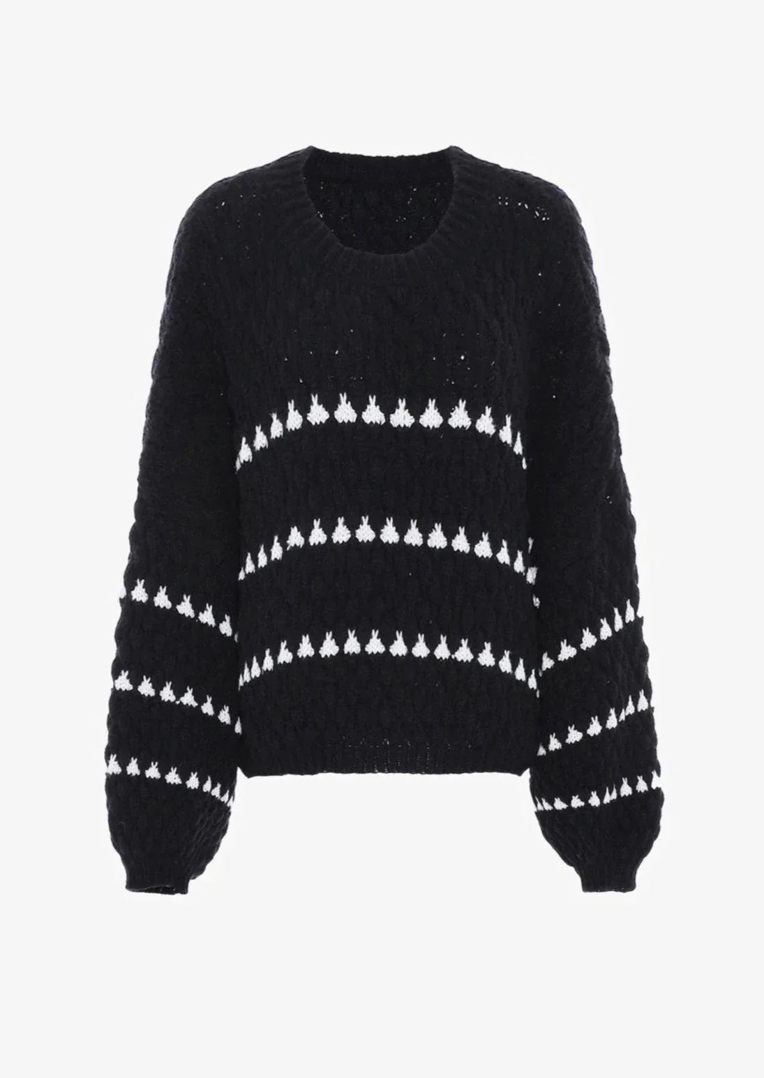 Denne striktrøje kombinerer tekstur og kontrast i et tidløst udtryk. Det gennemgående strukturstrik tilføjer dybde, mens de horisontale mønsterbånd skaber en moderne og grafisk effekt. De voluminøse ærmer og det afslappede snit sikrer både komfort og visuel fylde – ideel til lag-på-lag styling i de kølige måneder.