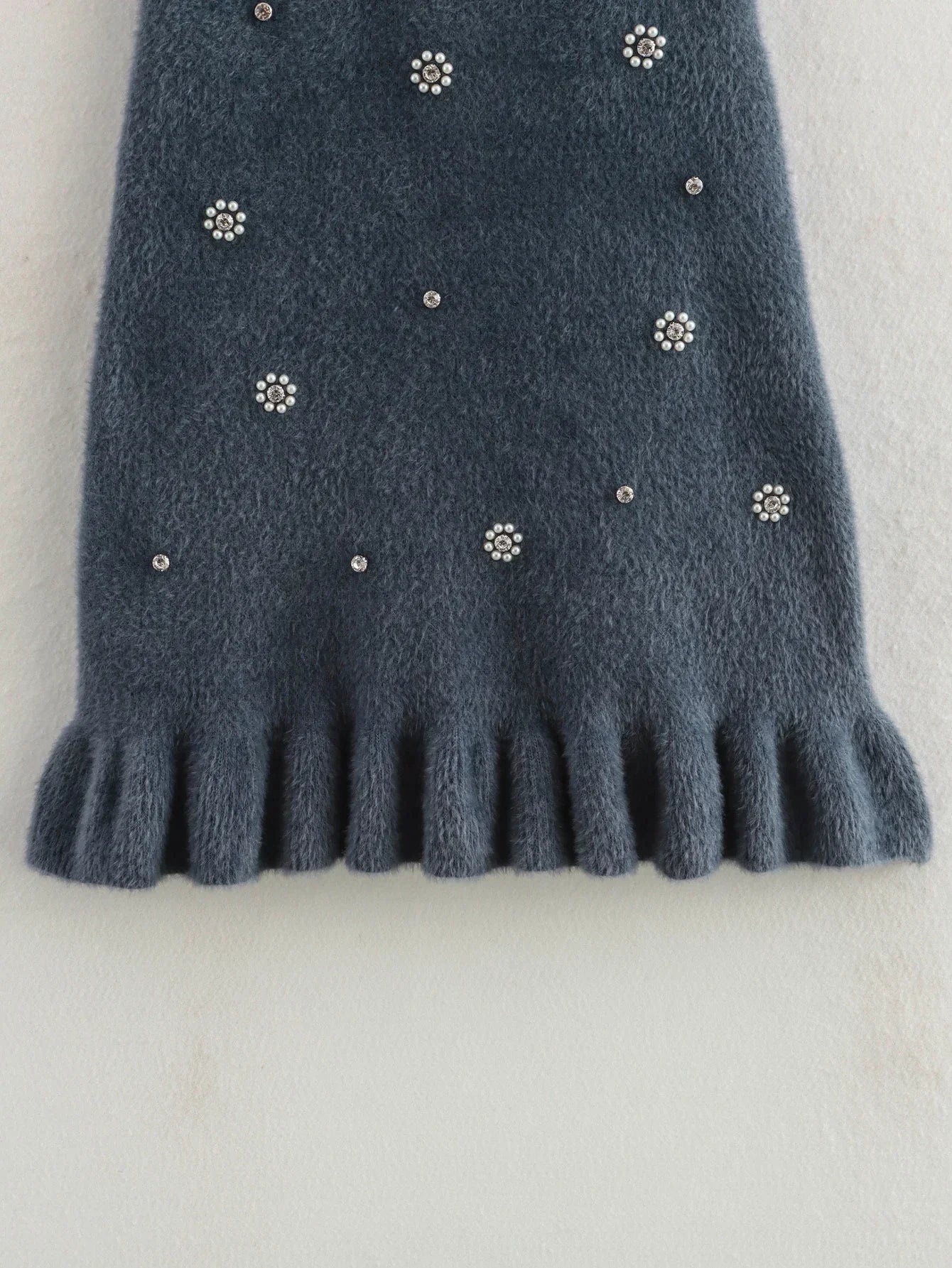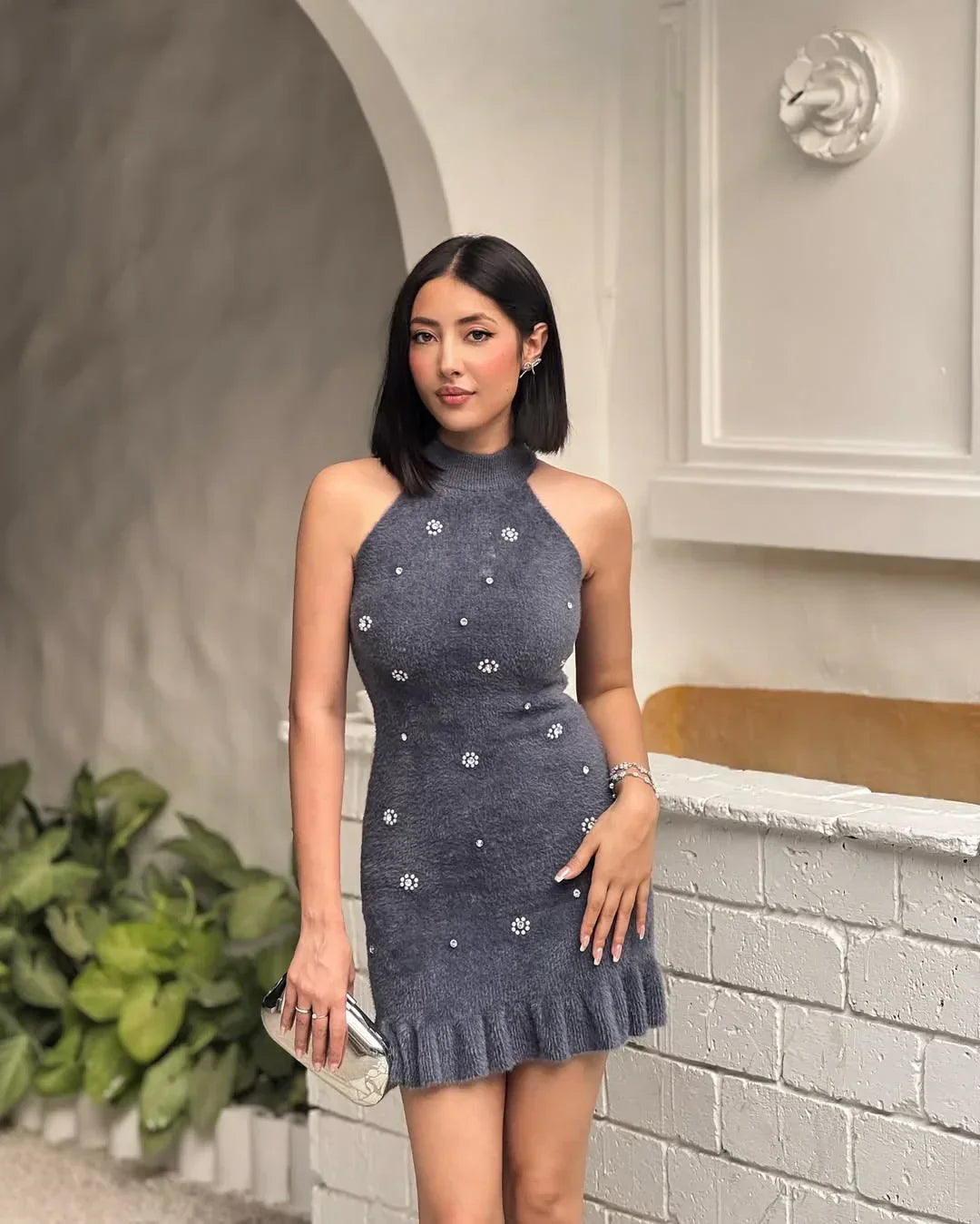 Denne tætsiddende strikkjole med høj hals og perledetaljer skaber et sofistikeret og eksklusivt look. De fine perleudsmykninger tilfører et luksuriøst touch, mens den ribstrikkede kant giver en smuk afslutning. Perfekt til både elegante middage og stilfulde hverdagslooks.