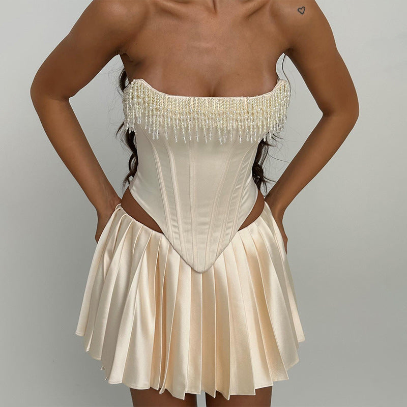Stropløs Korsettop med Perledetaljer | Champagnefarvet | Satin | Glamourøs og Elegant