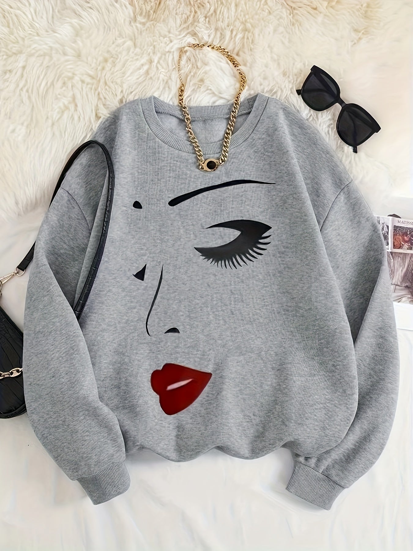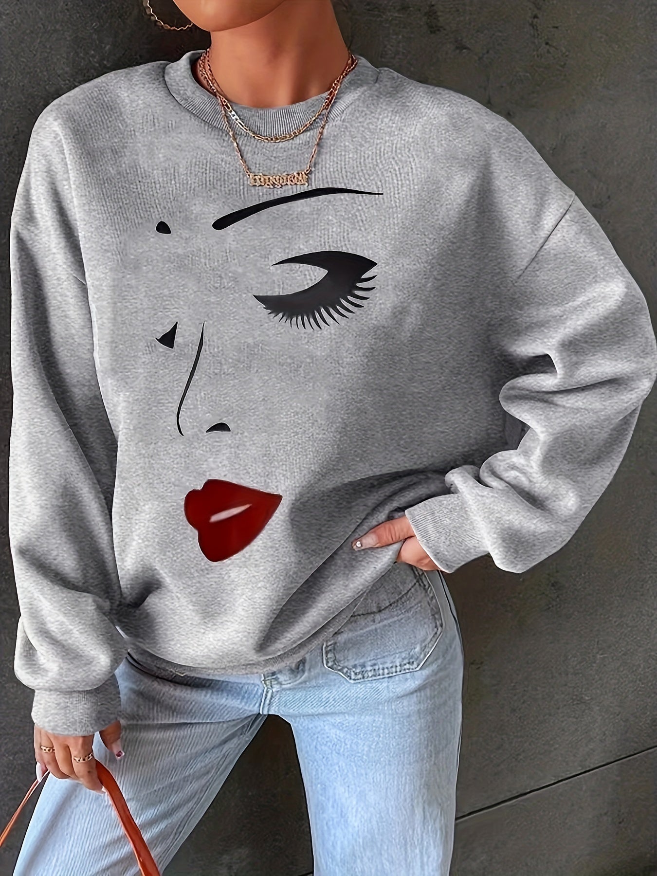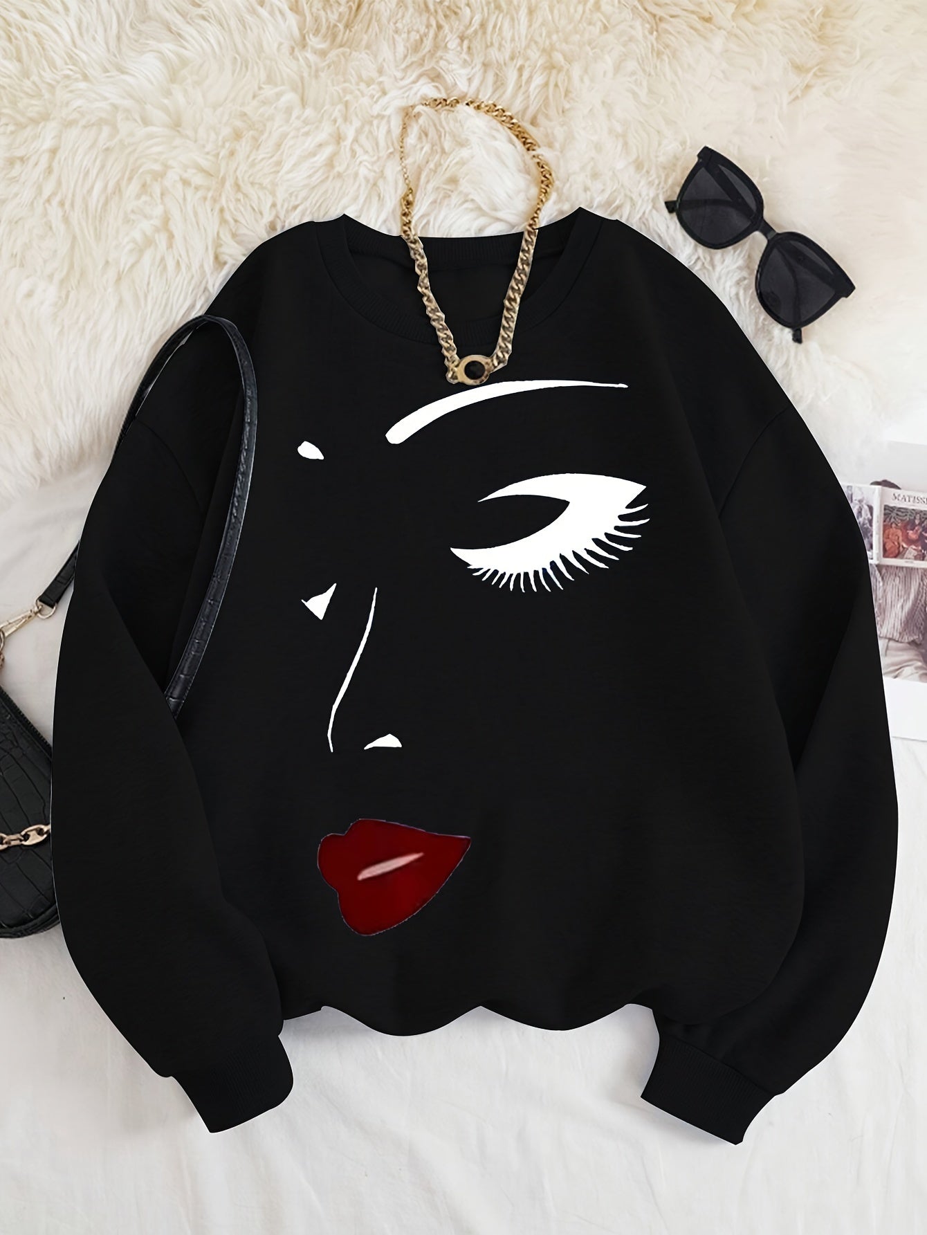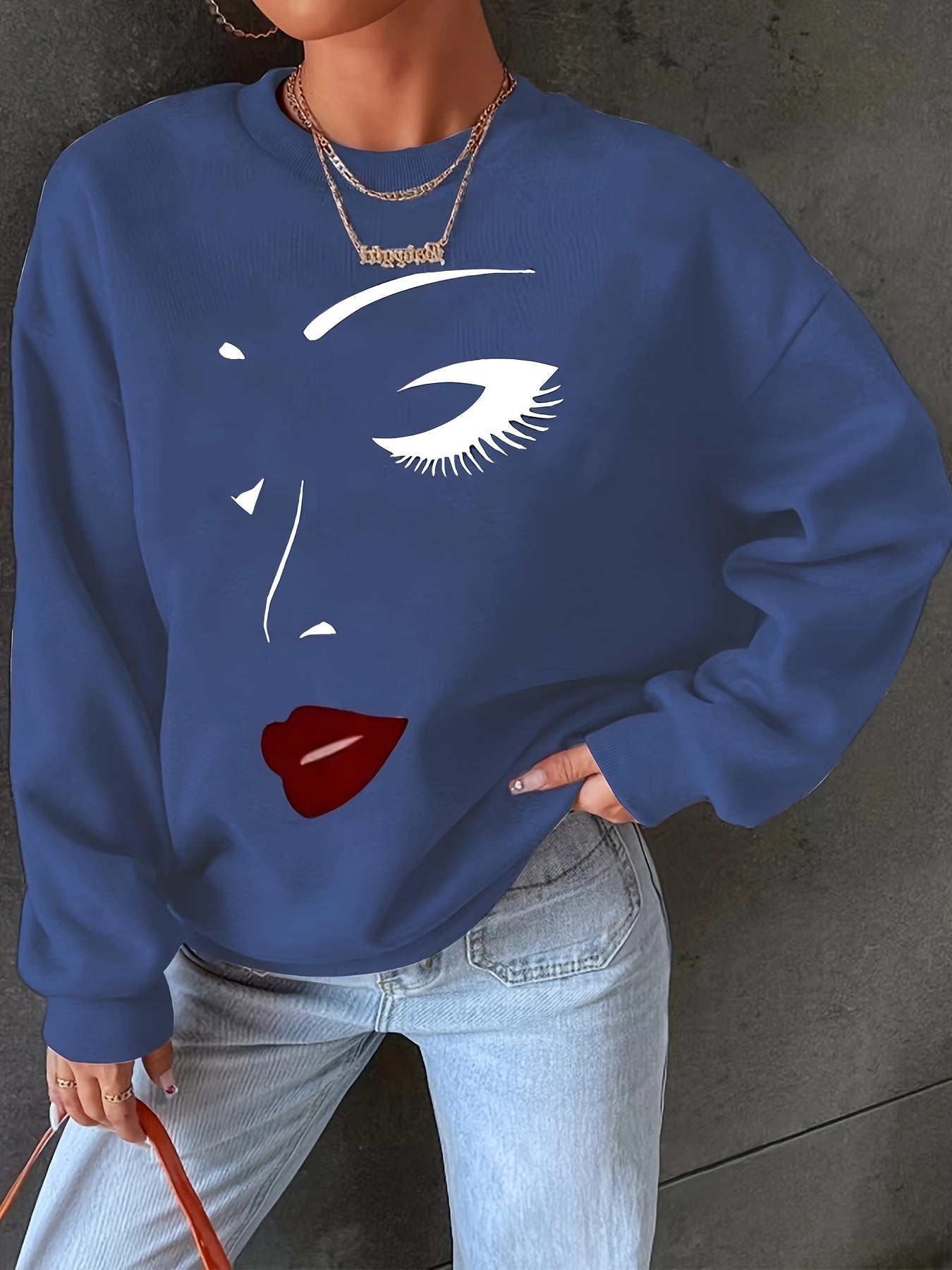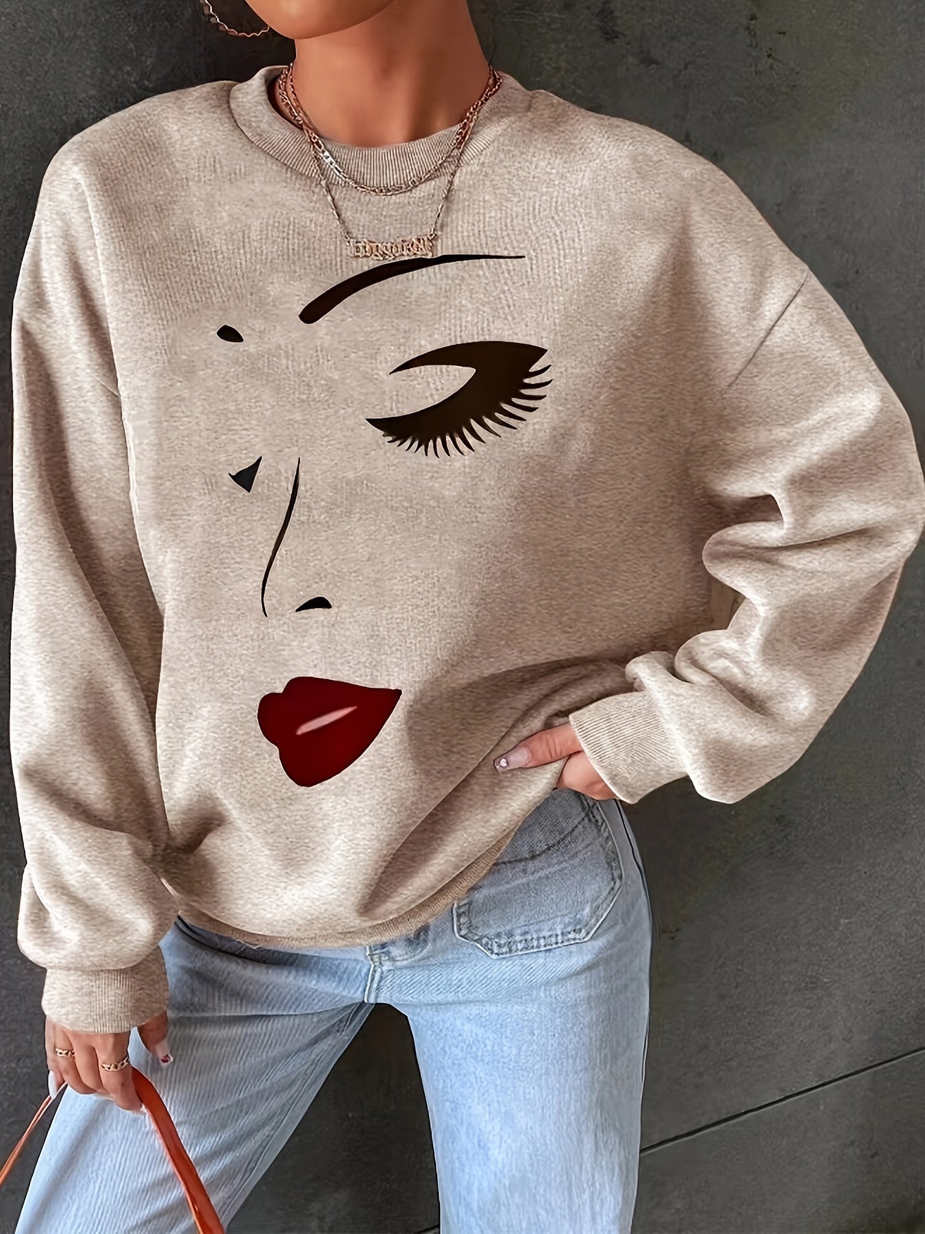 Denne sweatshirt udmærker sig med sit grafiske tryk af et stiliseret ansigt, der giver designet en unik og moderne karakter. Den bløde polyesterblanding føles behagelig mod huden og er ideel til afslappede hverdage. Med sin løse pasform og klassiske rund hals er den let at style og passer perfekt til både jeans og leggings.