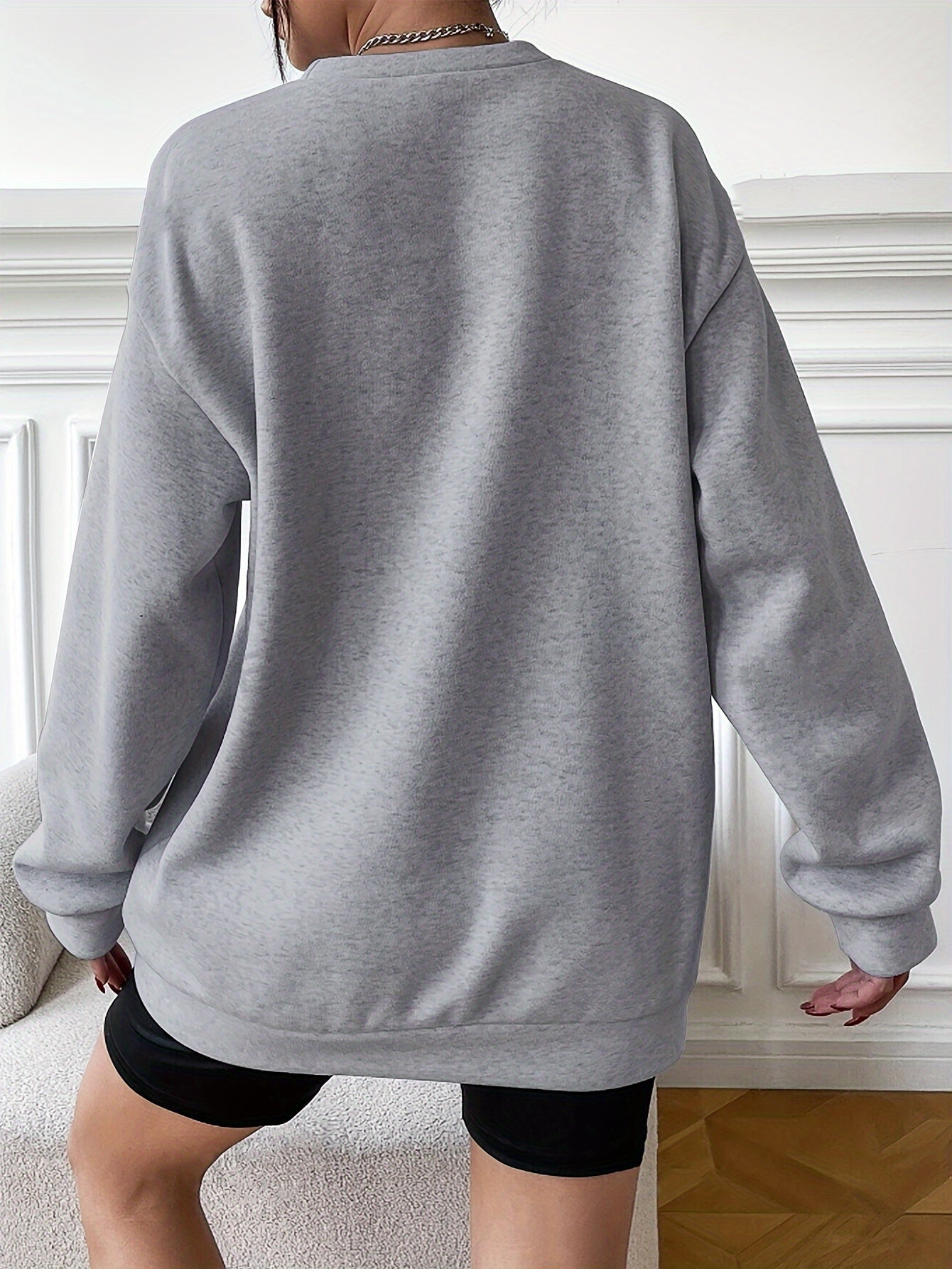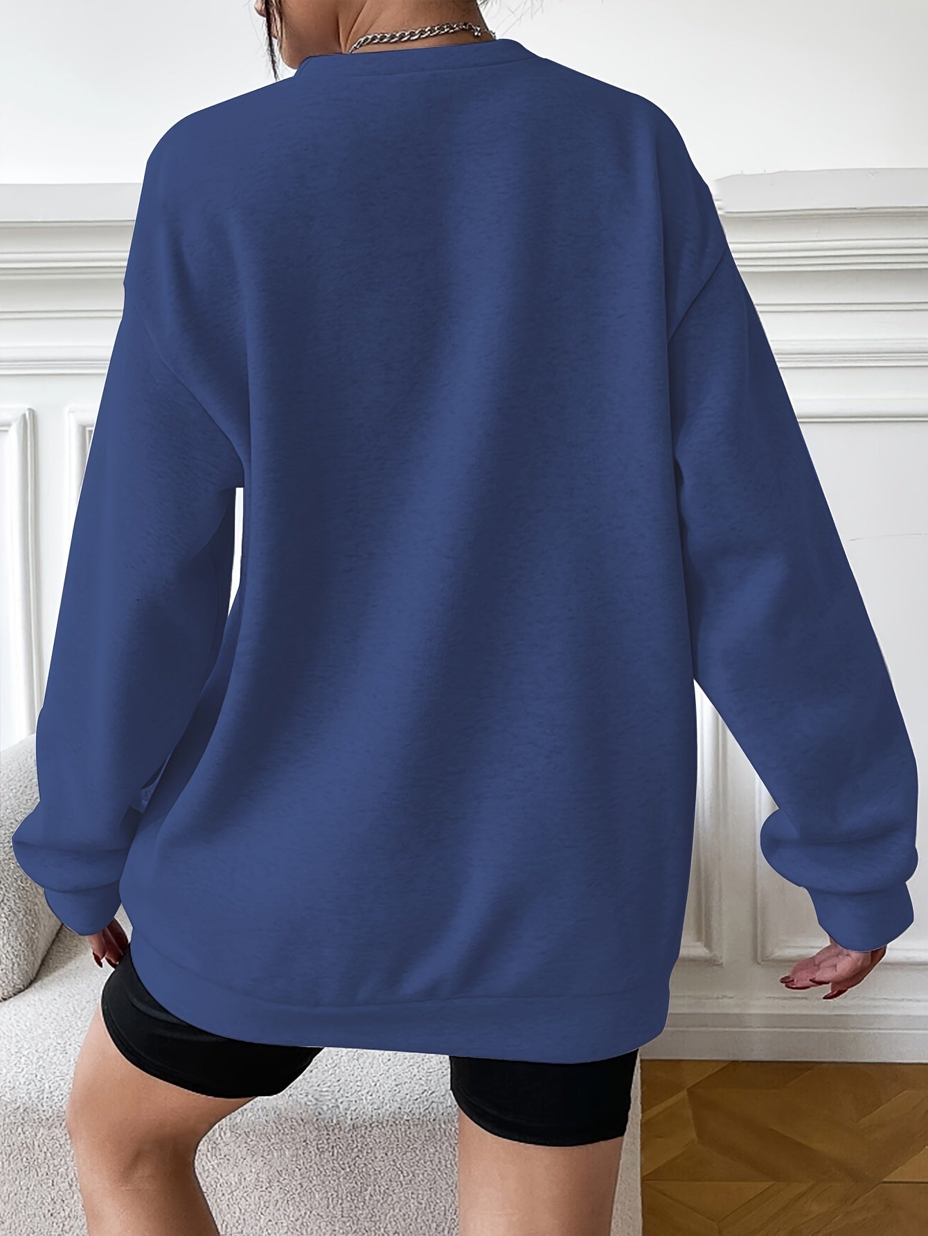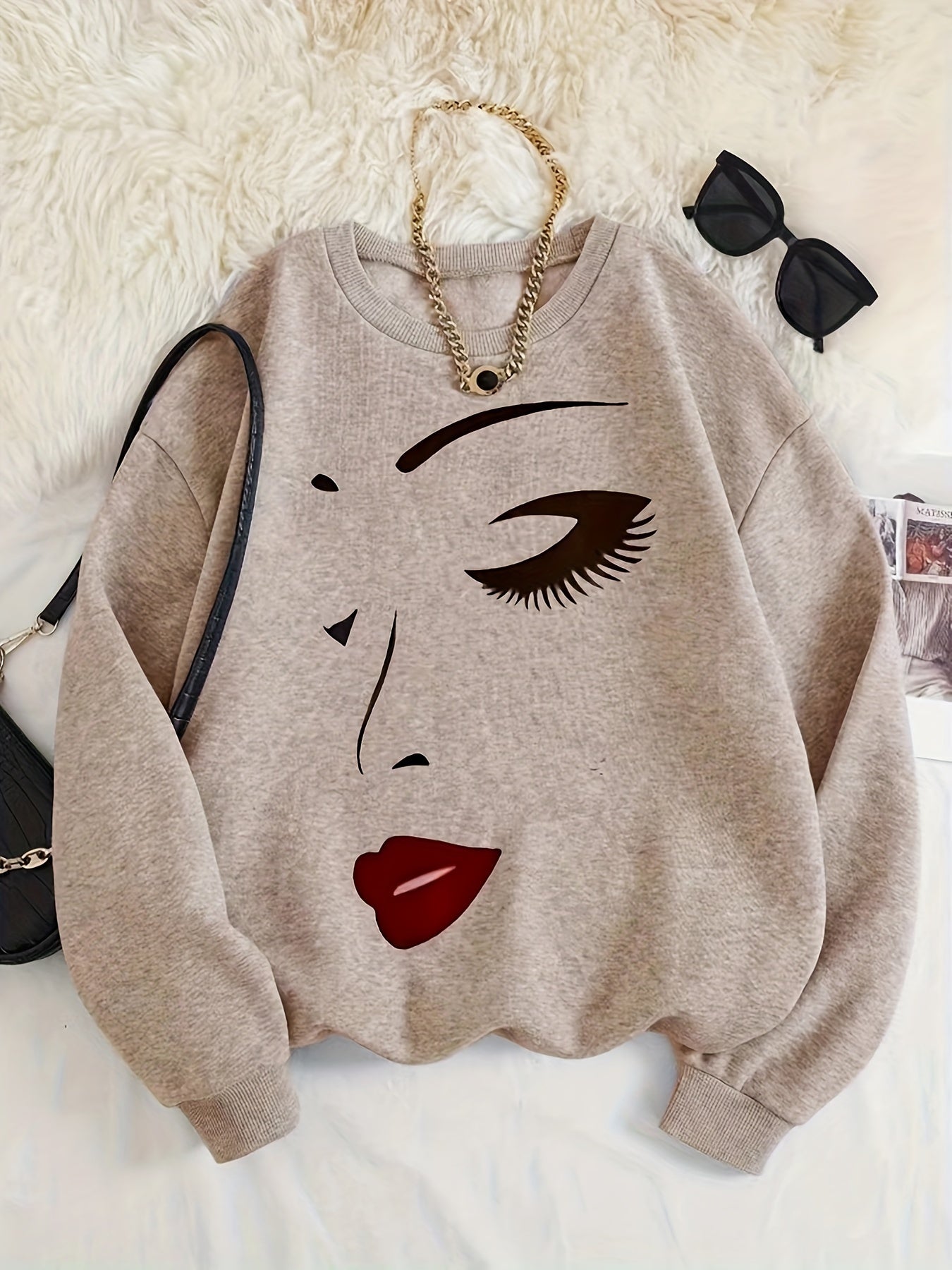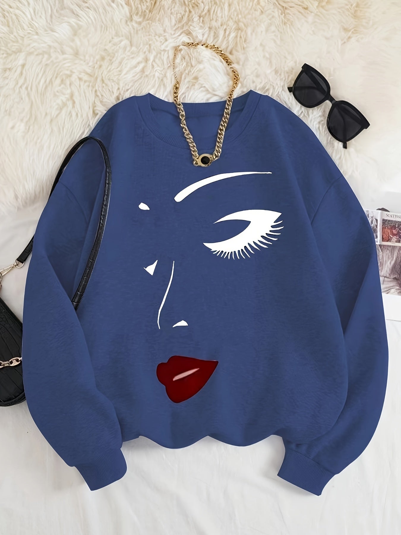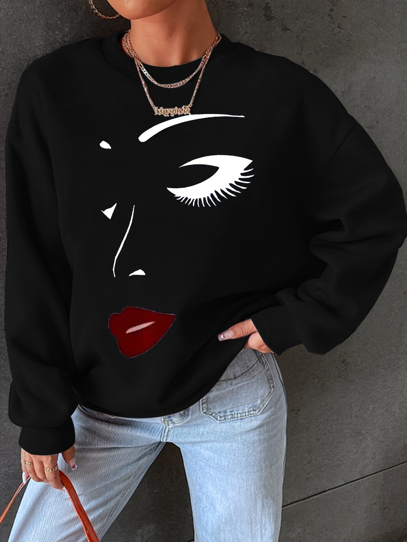 Denne sweatshirt udmærker sig med sit grafiske tryk af et stiliseret ansigt, der giver designet en unik og moderne karakter. Den bløde polyesterblanding føles behagelig mod huden og er ideel til afslappede hverdage. Med sin løse pasform og klassiske rund hals er den let at style og passer perfekt til både jeans og leggings.