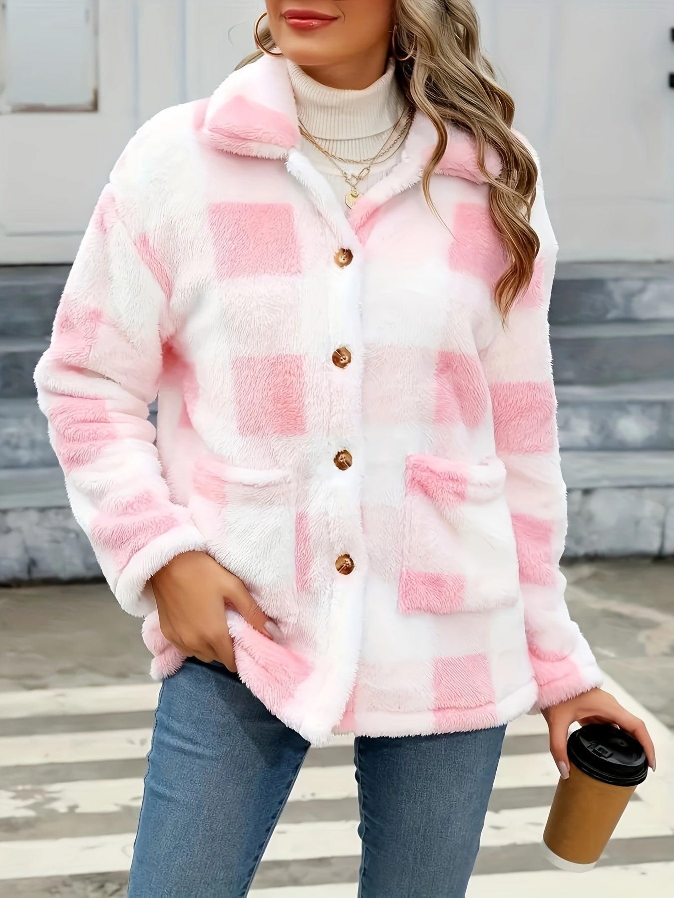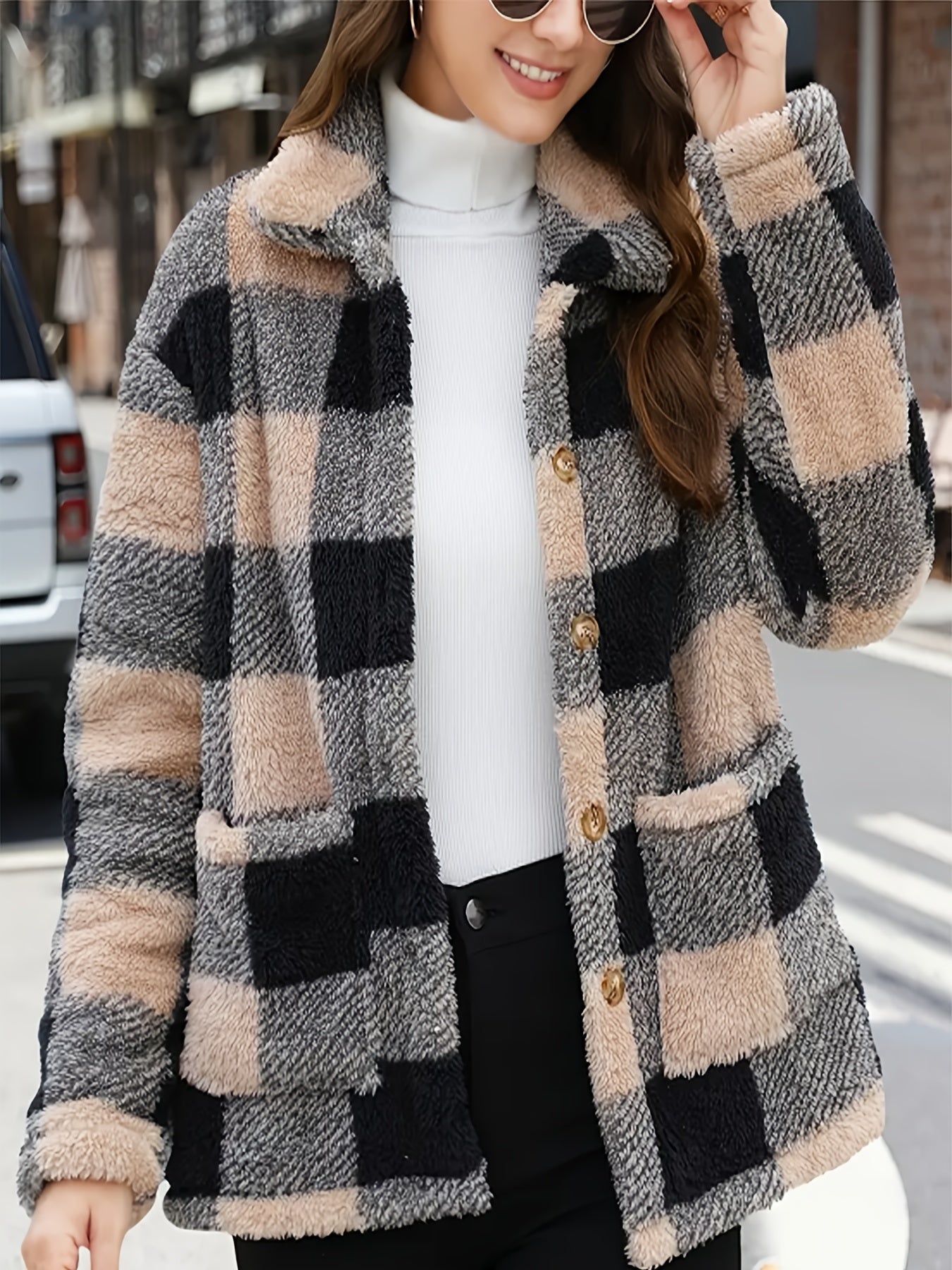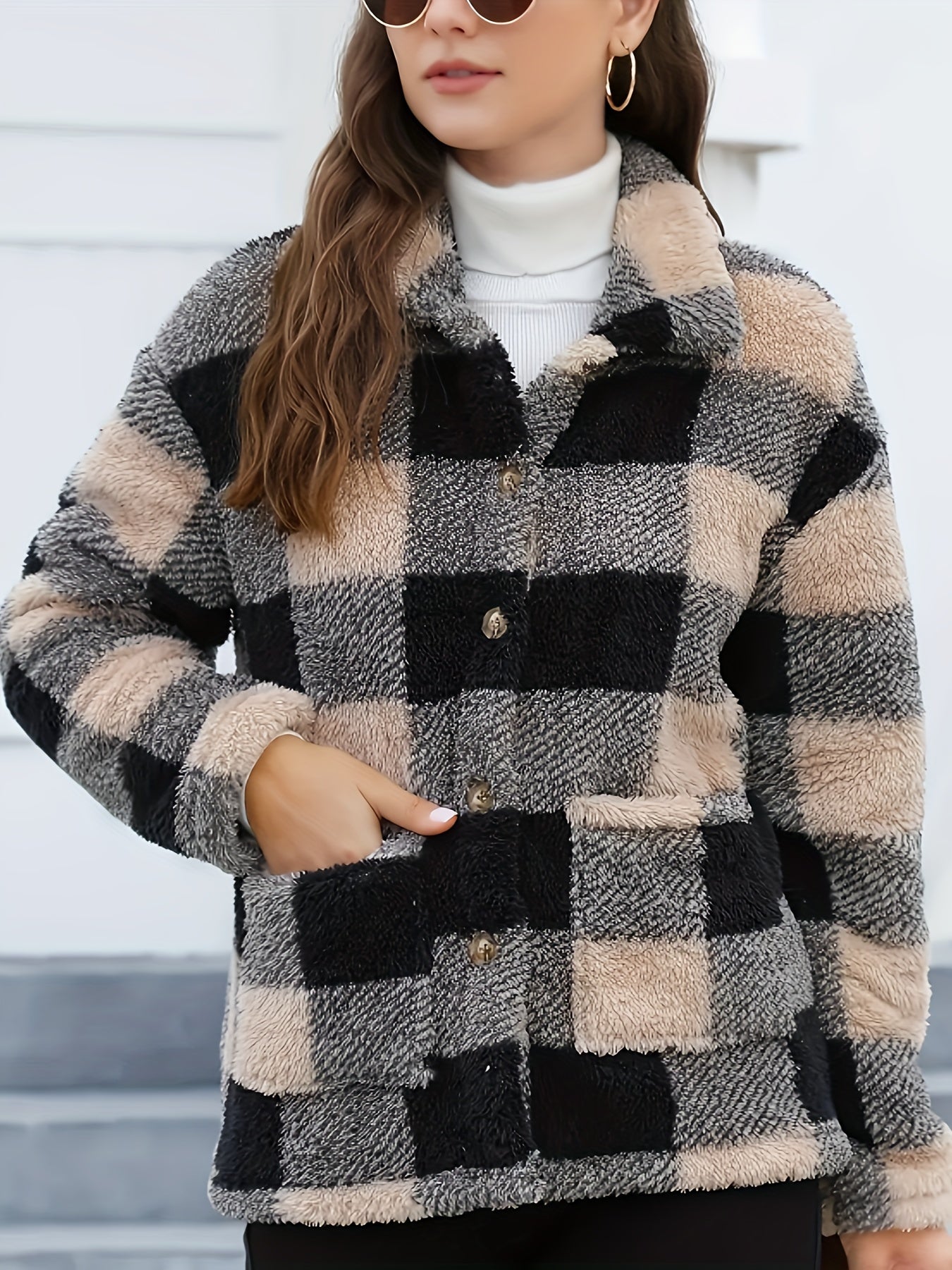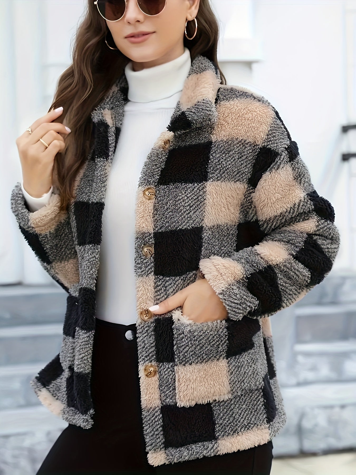 Denne teddyskjorte med ternet mønster er både stilfuld og funktionel. Det bløde og fluffy materiale sikrer varme, mens det grafiske ternede design tilfører et trendy og iøjnefaldende look. De dekorative knapper og rummelige lommer gør den praktisk til hverdagsbrug, og pasformen giver god bevægelsesfrihed.