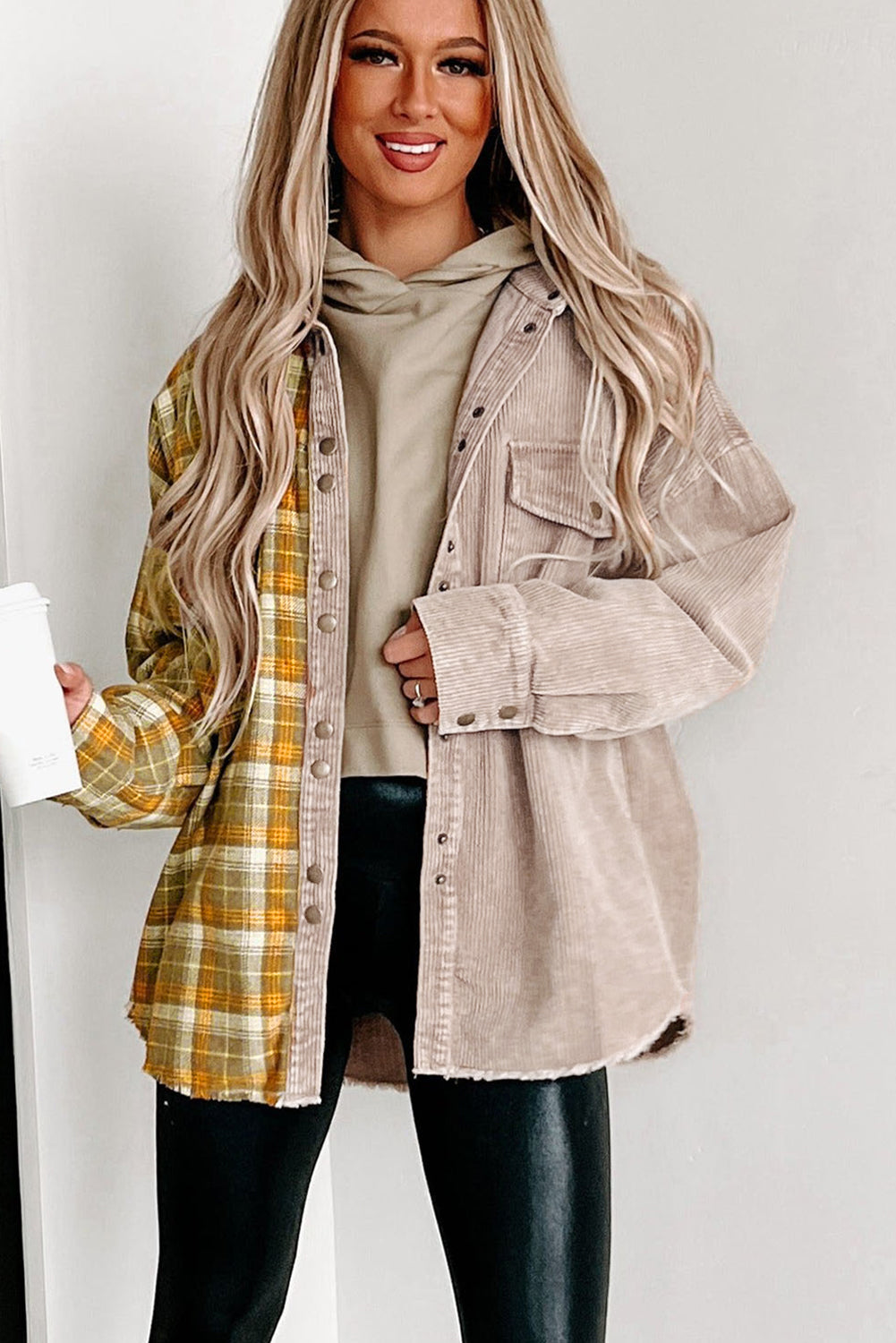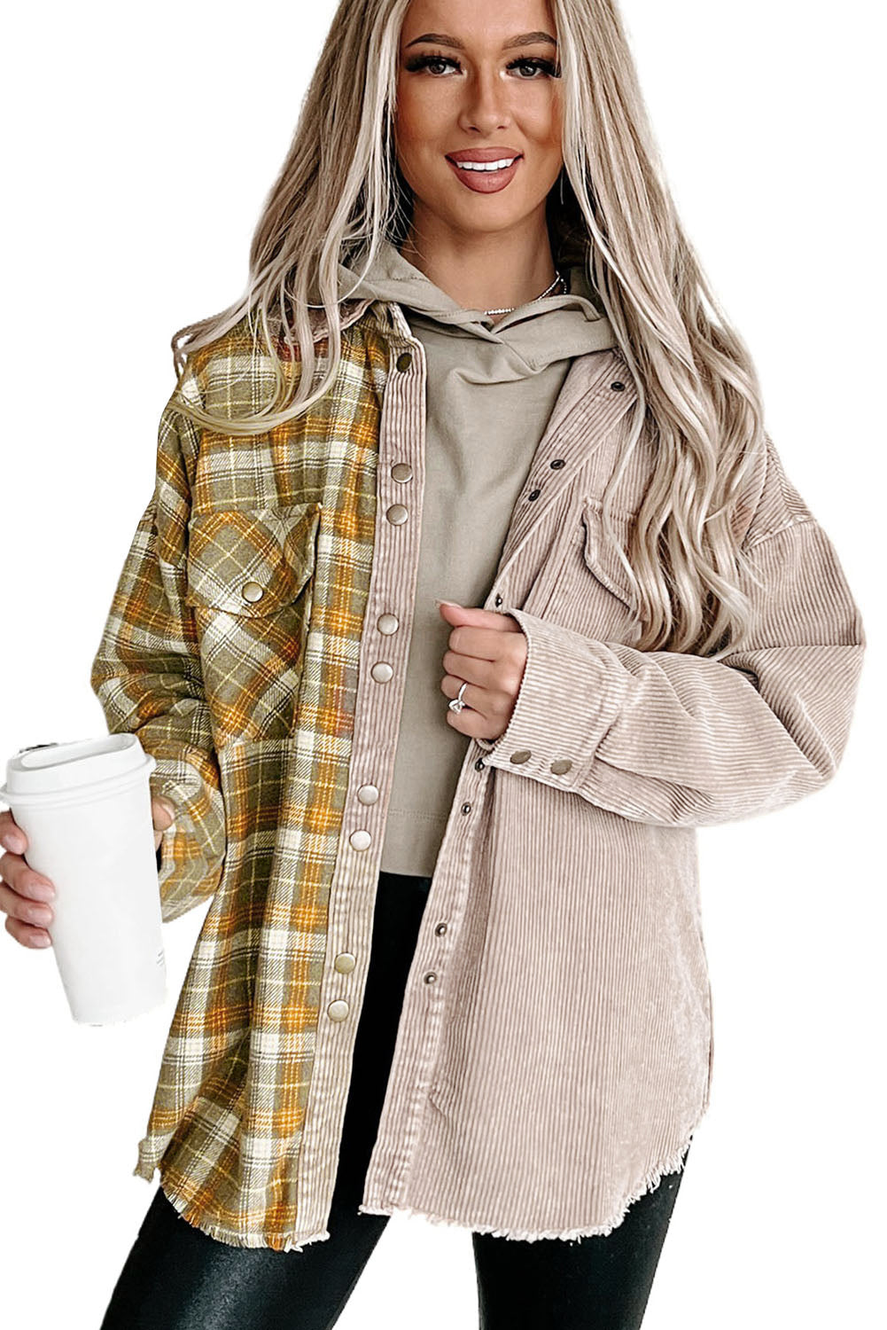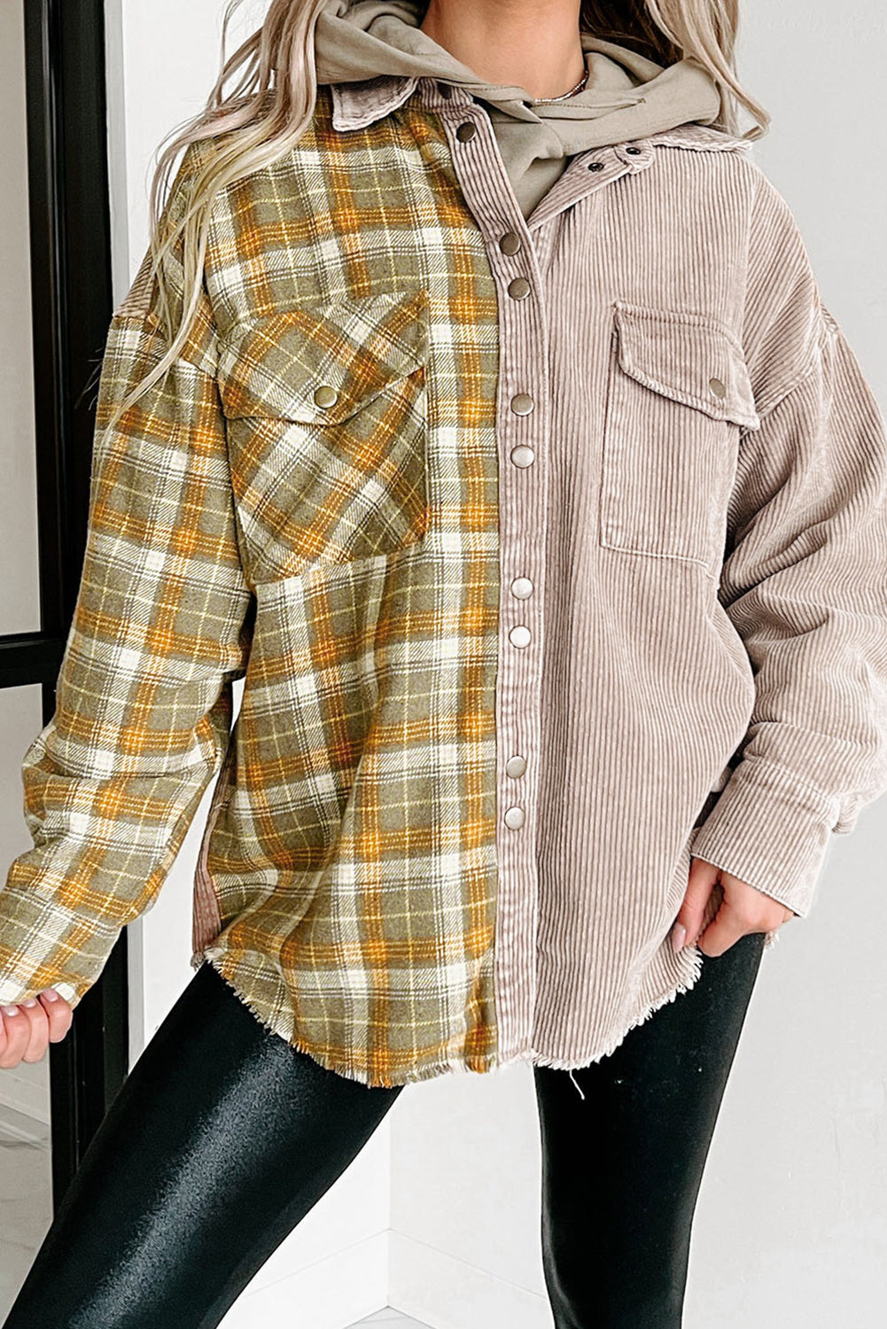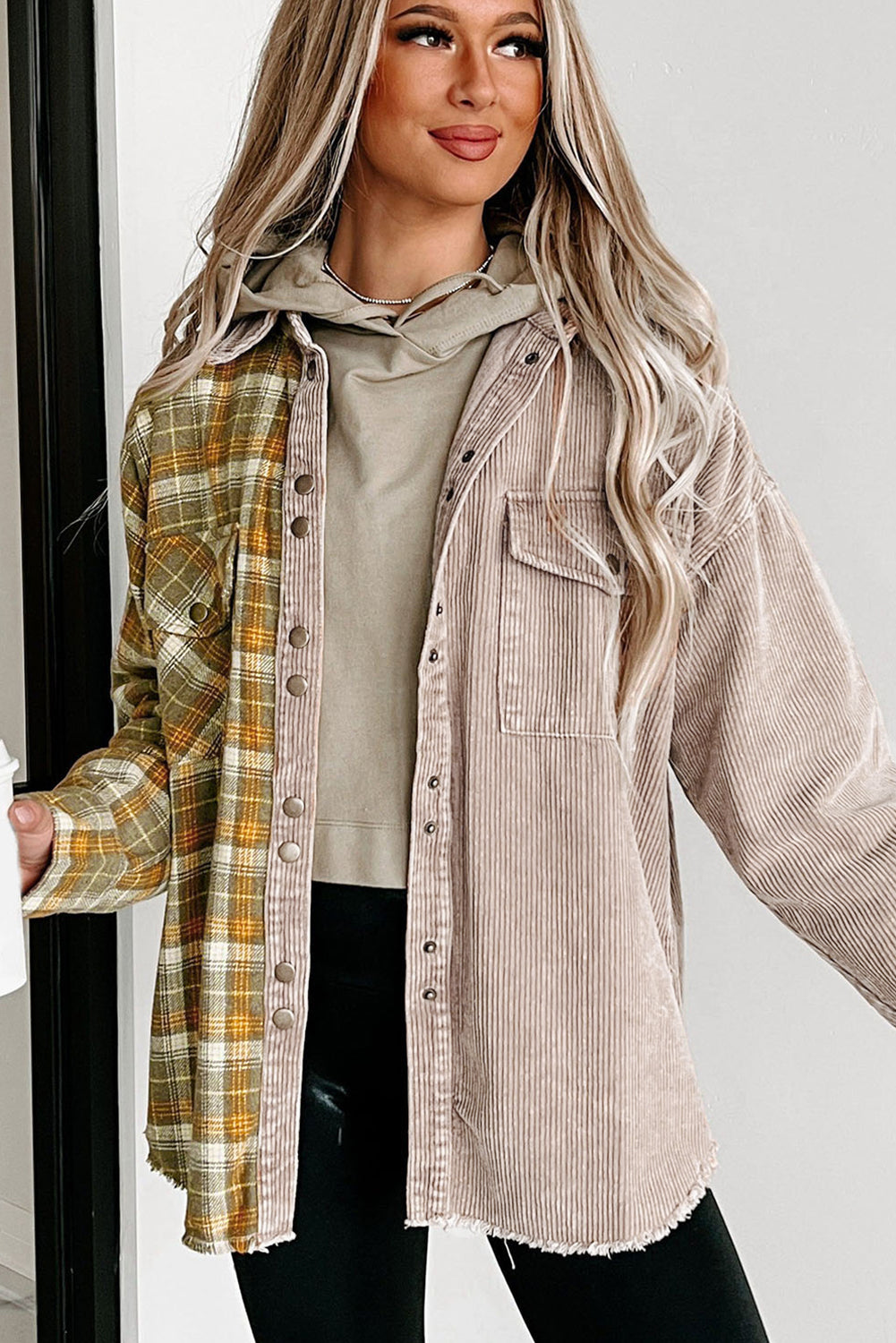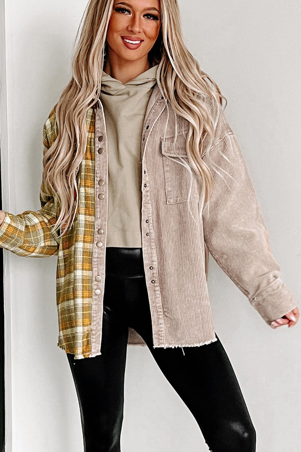 Denne skjortejakke kombinerer det bedste fra to verdener – blødt fløjl og klassisk tern. Det asymmetriske design med en side i struktureret fløjl og den anden i varm ternet bomuld skaber et moderne og legende look. Den har trykknapper hele vejen, brystlommer på begge sider og et let afslappet snit – perfekt til lag-på-lag styling.