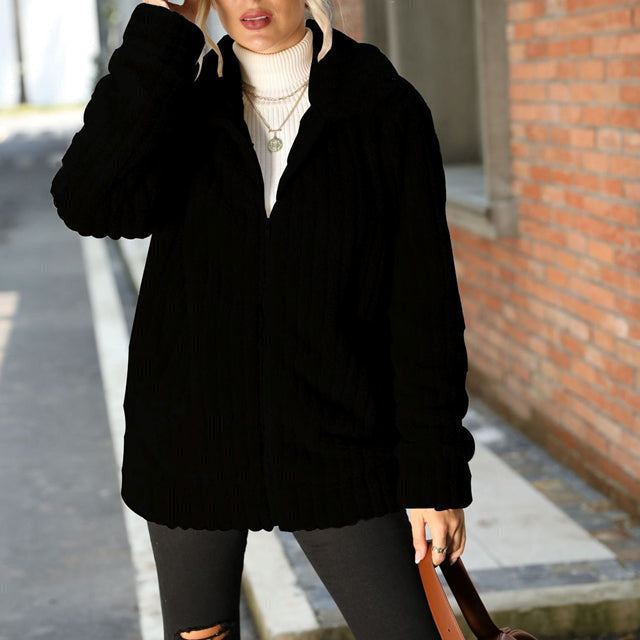 Denne kortere plysjakke med lodret struktur og høj krave er perfekt til dig, der ønsker både stil og komfort i én løsning. Den bløde, opkradsede tekstur indbyder til varme og hygge, mens lynlåslukningen og den simple silhuet gør den let at style til hverdag.