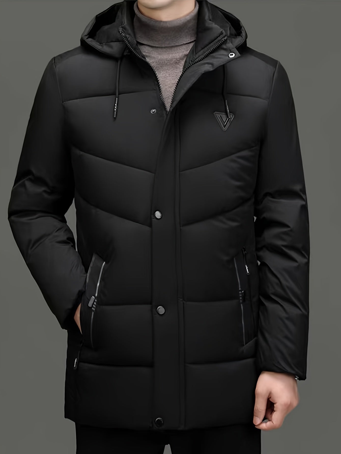 Denne lange, polstrede herrejakke er designet til at klare vinterens udfordringer med både funktion og elegance. Den aftagelige hætte, det justerbare snøresystem og den kombinerede lynlås- og trykknaplukning giver fleksibilitet og isolering, mens det rene design gør jakken velegnet til både hverdagsbrug og byliv.