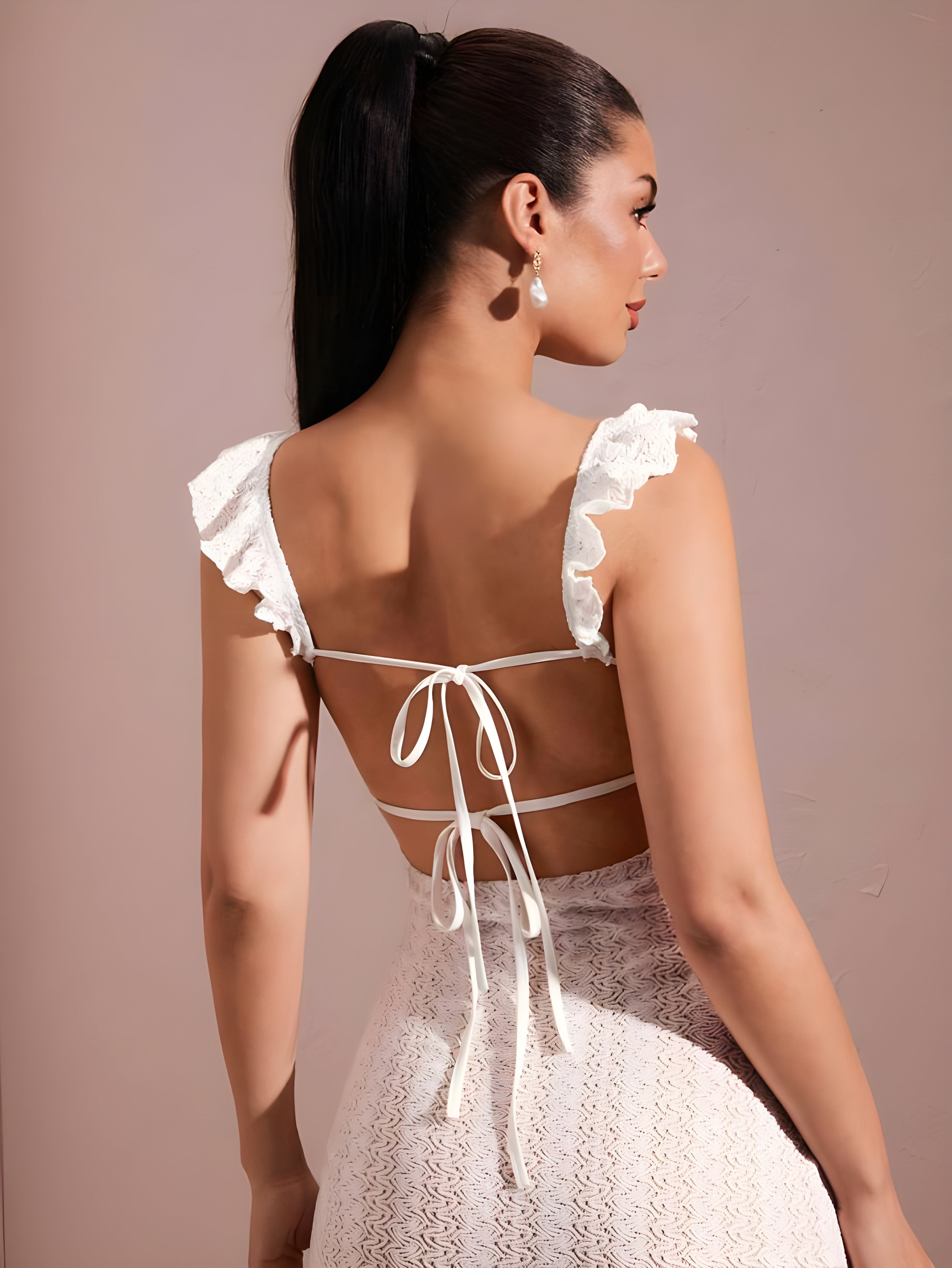 Gør et fantastisk indtryk med vores Elegante Hvide Maxi Kjole, der forener sofistikeret stil med et sexet twist. Kjolen er designet med en smuk hæklet tekstur og et elegant off-shoulder-look, der fremhæver din feminine silhuet. Den åbne ryg og det flydende fald giver et sofistikeret og iøjnefaldende udtryk, perfekt til sommerfester, strandture eller romantiske aftener.
