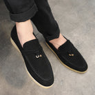 Disse herre loafers er udført i blødt materiale med ruskindsstruktur og har et klassisk slip-on design med dekorativ detalje på vristen. Den fleksible gummisål sikrer let bevægelse og komfort hele dagen, mens den minimalistiske silhuet gør dem perfekte til både hverdag og mere formelle anledninger.