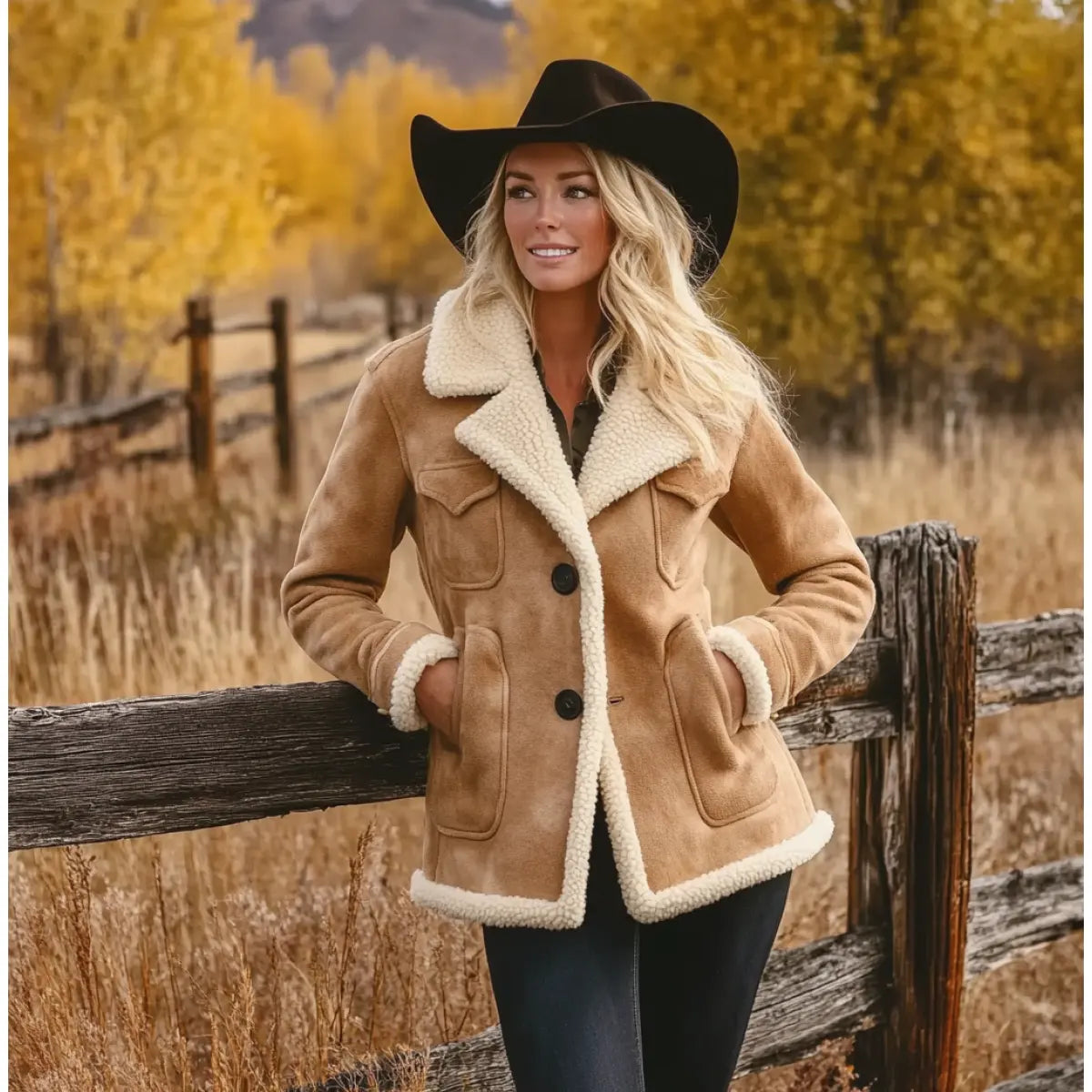Oplev den perfekte kombination af varme, komfort og western-inspireret stil med denne smukke shearling-jakke. Den bløde, vamset fleecekant giver et hyggeligt og luksuriøst udtryk, mens den strukturerede yderside skaber en tidløs, naturfarvet look. Jakken er ideel til kolde dage, hvor du både vil holde varmen og se fantastisk ud.