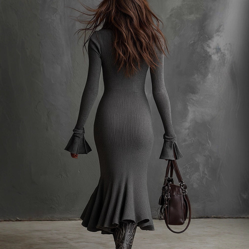 Gør indtryk med denne elegante lange strikkjole, designet til kvinder der ønsker en kombination af elegance, komfort og moderne stil. Den figursyede pasform fremhæver kroppens linjer, mens det let udsvingede skørt giver en smuk, flydende silhuet. Den høje krave med lynlåslukning tilføjer et moderigtigt touch, og de lange ærmer med klokkeafslutning fuldender looket med femininitet og finesse. Perfekt til både hverdagsbrug og aftenanledninger.