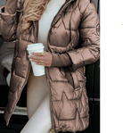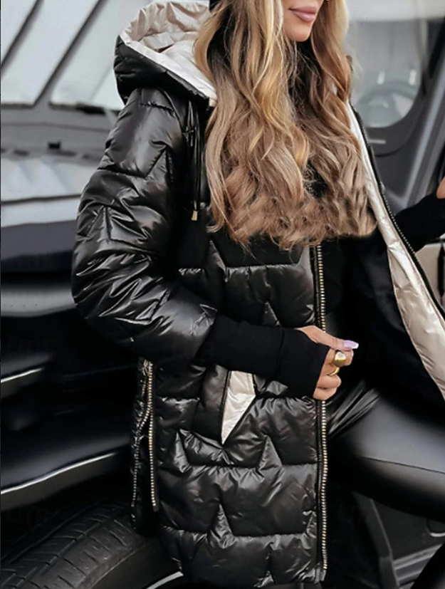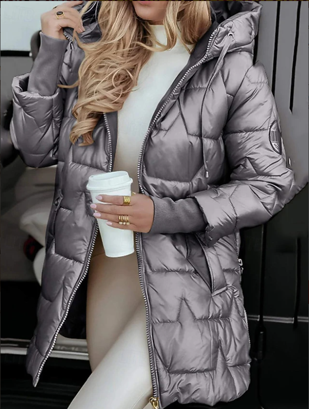 Hold dig stilfuldt varm denne vinter med vores elegante lange vinterdynejakke, designet til kvinder der ønsker både funktionalitet og et luksuriøst look. Jakken har en glansfuld finish og bløde quiltede detaljer, som giver et eksklusivt udtryk samtidig med optimal varmeisolering. Den lange pasform og den forede hætte gør jakken perfekt til kolde dage, hvor komfort og stil skal gå hånd i hånd.