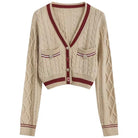 Tilføj et stilfuldt touch til din garderobe med denne elegante korte strikcardigan. Det flettede strikdesign kombineret med kontrastkanter skaber et klassisk, men moderne look. Med dekorative knapper og lommedetaljer giver denne cardigan et eksklusivt og feminint udtryk. Perfekt til at style med nederdele eller højtaljede bukser for en chic finish.