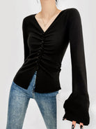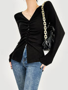 Denne stilfulde strikcardigan har en smigrende V-udskæring og en unik rynkedetalje med knapper, der fremhæver kroppens former på en elegant måde. De lange ærmer med let vidde tilfører et sofistikeret touch, mens det bløde, elastiske stof sikrer en komfortabel pasform. Perfekt til både hverdagsbrug og aftenlook.