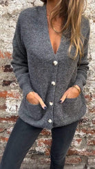 Denne smukke strikkede cardigan er et must-have i enhver garderobe. Det enkle design med store dekorative knapper og praktiske lommer skaber et tidløst look, mens den bløde kvalitet sikrer maksimal komfort. Perfekt til både hverdagsbrug og hyggelige dage.